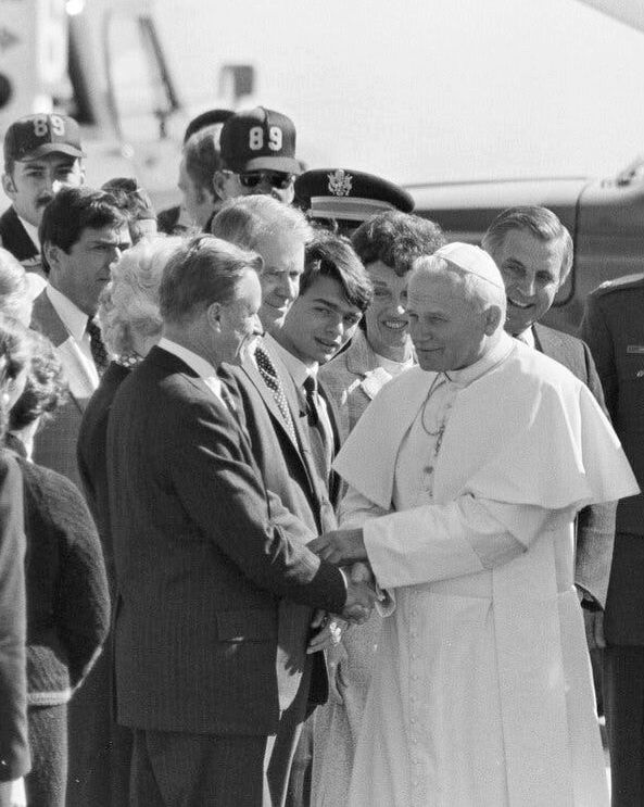 Na zdjęciu z Ronaldem Reaganem papież chwyta obie ręce prezydenta – klasyczna „ciepła rękawica”, którą stosował często także wobec innych przywódców. To ten sam motyw, który widzieliśmy w uścisku z Hirohito, tylko tu Wojtyła może sobie na niego pozwolić w pełni, bez ryzyka profanacji. Gest jest prosty, ale bardzo wyraźny: rozmówca nie jest funkcją, nie jest „panem prezydentem” w protokole – jest człowiekiem. Jesteś widziany, jesteś ważny, jesteś równy w tej chwili.