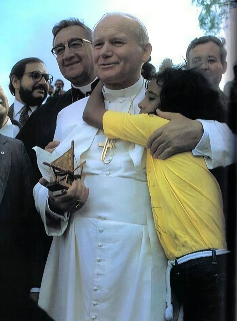 Chłopiec w jaskrawożółtej koszulce obejmuje papieża mocno, spontanicznie, niemal agresywnie. Wojtyła nie sztywnieje, nie odsuwa się, nie wykazuje odruchu dyskomfortu, który jest tak częsty u ludzi wysokiego statusu w takich sytuacjach. Stoi spokojnie, lekko rozbawiony, przyjmuje bliskość bez paniki. To pokazuje coś bardzo głębokiego: komfort z ciałem drugiego człowieka – nawet gdy to dziecko, nawet gdy to niekontrolowane, chaotyczne, nieprzewidywalne. Wielu przywódców w takiej chwili odruchowo się blokuje. On nie.