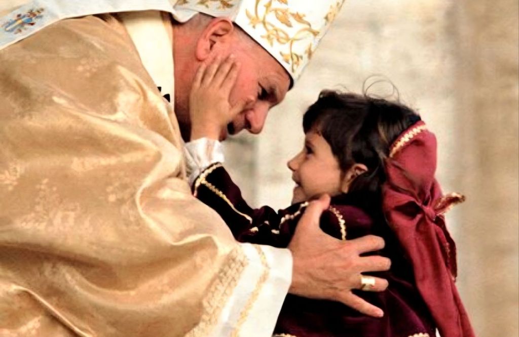 Papież nachyla się nad małą dziewczynką, trzyma jej twarz delikatnie w dłoniach, kontakt wzrokowy bezpośredni i miękki, gest symetryczny i spokojny. Dziewczynka dotyka jego policzka – i on na to pozwala, czuje się z tym całkowicie komfortowo. To klasyczny gest rodzica: „Jesteś widziana. Jesteś ważna. Jesteś bezpieczna.” Wojtyła robił to naturalnie, bez skrępowania i ludzie to czuli. Dotyk obniża lęk, buduje więź szybciej niż najdłuższe przemówienie.