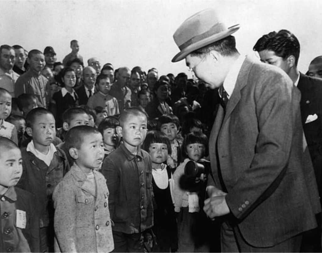 Hirohito wzmacnia ten dystans: pochylony „inspekcyjnie”, brak dotyku, pełna kontrola, zero spontaniczności. To nie jest człowiek, który chce „rozbroić” dzieci – to figura realizująca rolę.