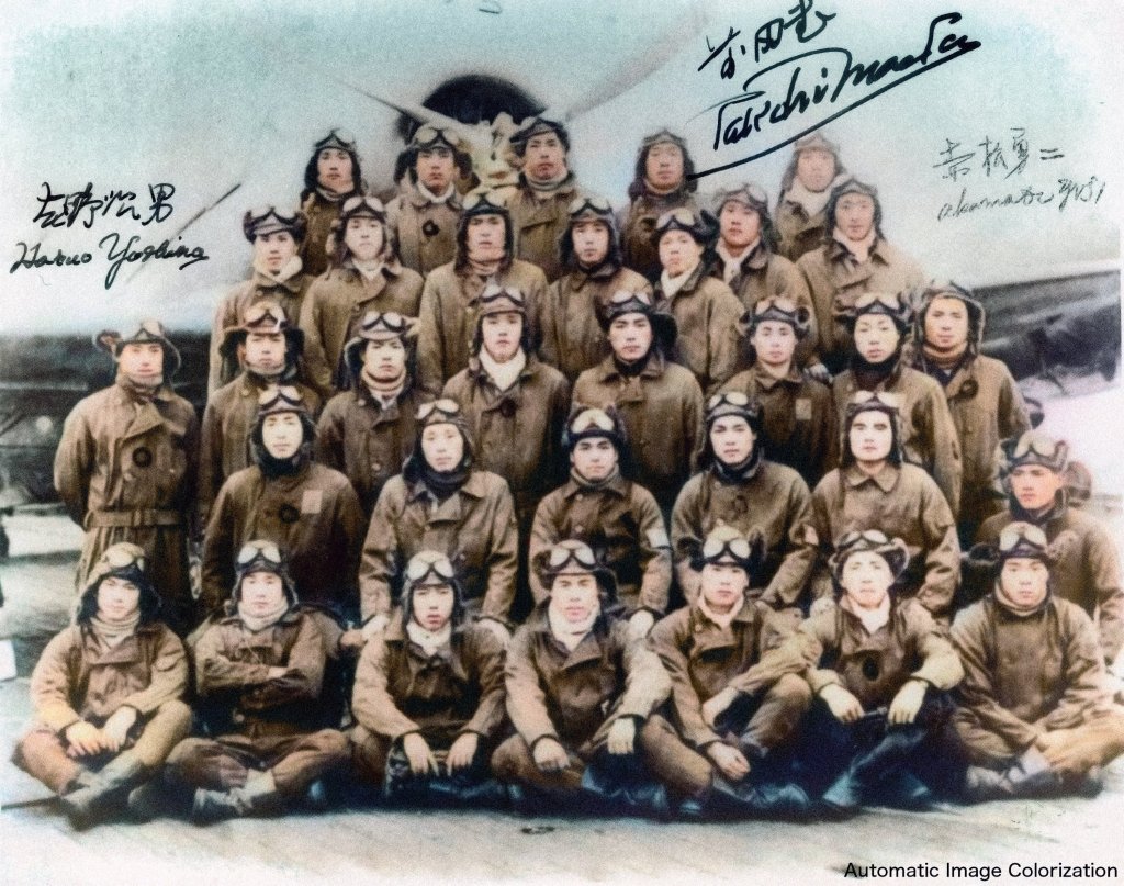6 grudnia 1941 r. Pamiątkowa fotografia członków załogi lotniskowca „Kaga” (zatopiony 7 miesięcy później w bitwie pod Midway) zmierzającego w kierunku Pearl Harbor.