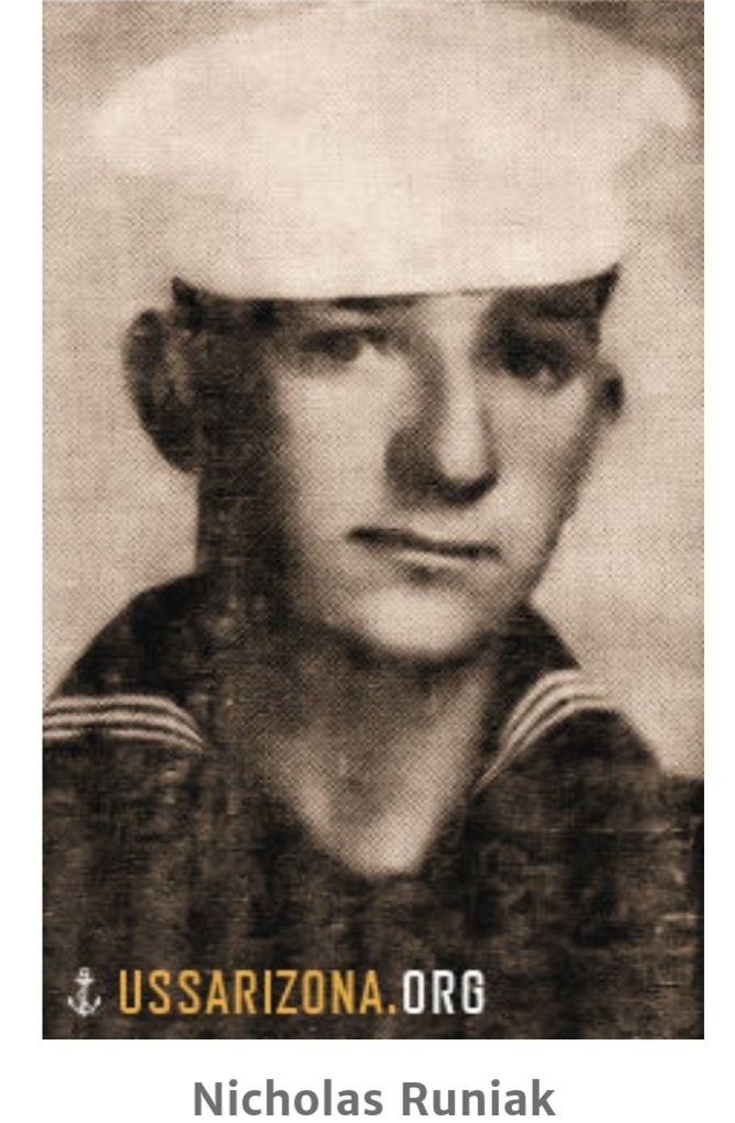 Bomby i kule spadały na zacumowane w porcie okręty. O 8:10, bomba o masie 800 kg przebiła się przez pokład flagowego pancernika amerykańskiej floty na Pacyfiku USS Arizona i eksplodowała w prochowni. Po zaledwie 9 minutach okręt poszedł na dno, a wraz nim 1102 mężczyzn. Wśród 1177 oficerów i członków załogi pancernika (niemalże połowa z 2403 ofiar japońskiego ataku na Pearl Harbor) którzy tego dnia stracili życie znalazło się kilkunastu Amerykanów polskiego pochodzenia. Wszyscy zostali pośmiertnie odznaczeni medalem serca purpurowego.