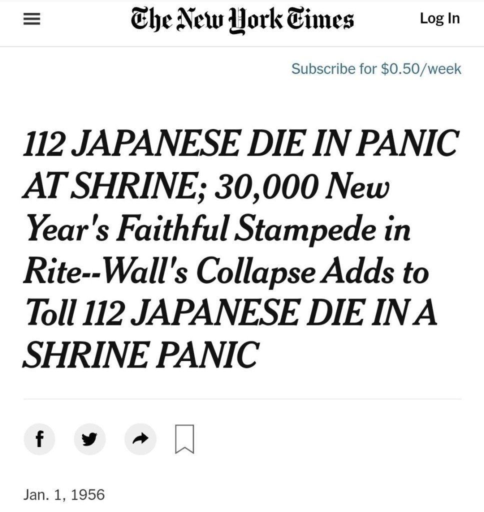 1 stycznia 1956 roku 30-tysięczny tłum, który zebrał się na mochimaki w świątyni Yahiko-jinja w Yahiko zadeptał na śmierć 124 osoby (nie 112, jak podał NYT). Późnym wieczorem na nieoświetlonym dziedzińcu obiektu w wyniku paniki, która wybuchła po zawaleniu się muru uczestniczący w święcie ludzie zaczęli przewracać sie na schodach (📷).