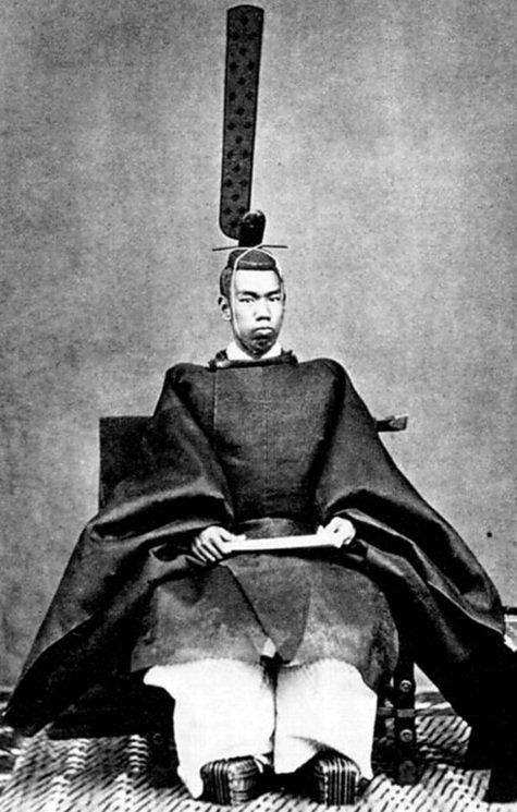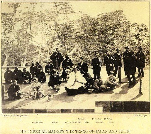 Pierwsza fotografia japońskiego cesarza została wykonana w r. 1872 bez pozwolenia i z ukrycia przez barona Raimunda von Steilfrieda, austriackiego fotografa działającego w Jokohamie. Von Steilfried ukrył się w żaglach na statku zacumowanym w porcie podczas wizyty Mutsuhito w stoczni Yokosuka. Cesarz Meiji, gdyż tak został po śmierci nazwany Mutsuhito, wraz z francuskimi inżynierami nadzorującymi prace w stoczni zasiadł na ziemi w pobliżu żaglowca i moment ten wykorzystał von Steilfried do zrobienia fotografii. Las w tle w przeciwieństwie do ludzi nie rzuca cienia, gdyż został dodany do fotografii już później w studio von Steilfrieda.