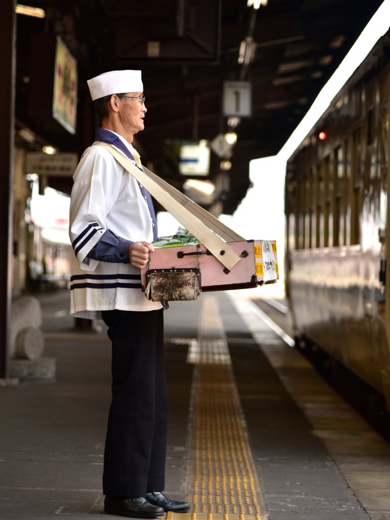 Ekiben (eki – stacja kolejowa, ben – bento, posiłek na wynos) to regionalne specjały pakowane w pudełka i sprzedawane podróżnym na stacjach kolejowych. Dziś najłatwiej jest kupić je w licznych punktach gastronomicznych rozstawionych na stacjach, ale chyba najprzyjemniej od handlarza, zwłaszcza takiego z wieloletnim doświadczeniem, jak Pan Toyomi Iris, który od 50 lat (2019) na stacji Hitoyoshi dźwiga swój ciężki, 15 kg pojemnik z ekiben.