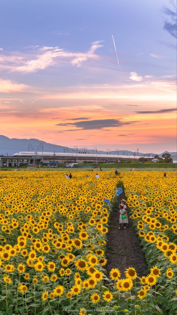 Piękna fotografia pola słoneczników o wschodzie słońca z Shinkansenem w tle. Mnie jednak najbardziej urzekły skupione na chwytaniu owadów dziewczynki w gustownych kapelusikach. W Seulu również sporo dzieci teraz w okresie wakacyjnym (ale często w krótkich chwilach odpoczynku pomiędzy zajęciami w akademiach hagwon, do których uczęszczają również latem) biega z siatkami i pudełkami na owady, choć bez kapeluszy i zbyt często wyręczają je w tym rodzice, zwłaszcza mamy.