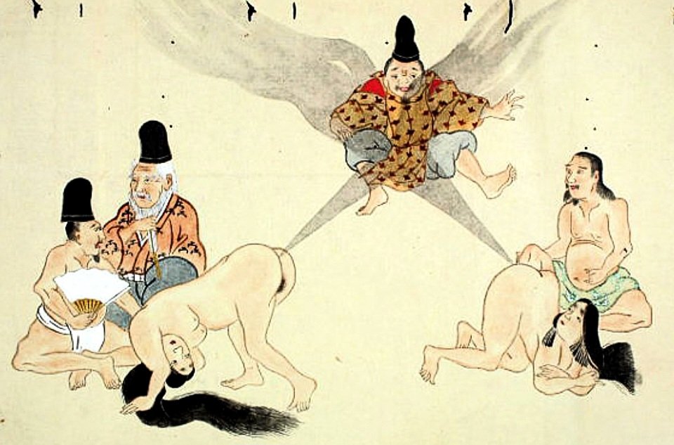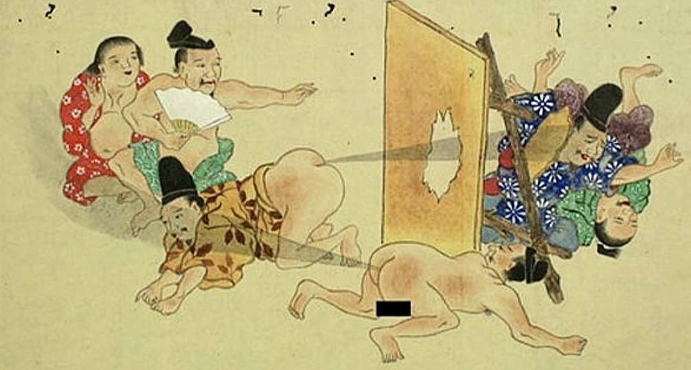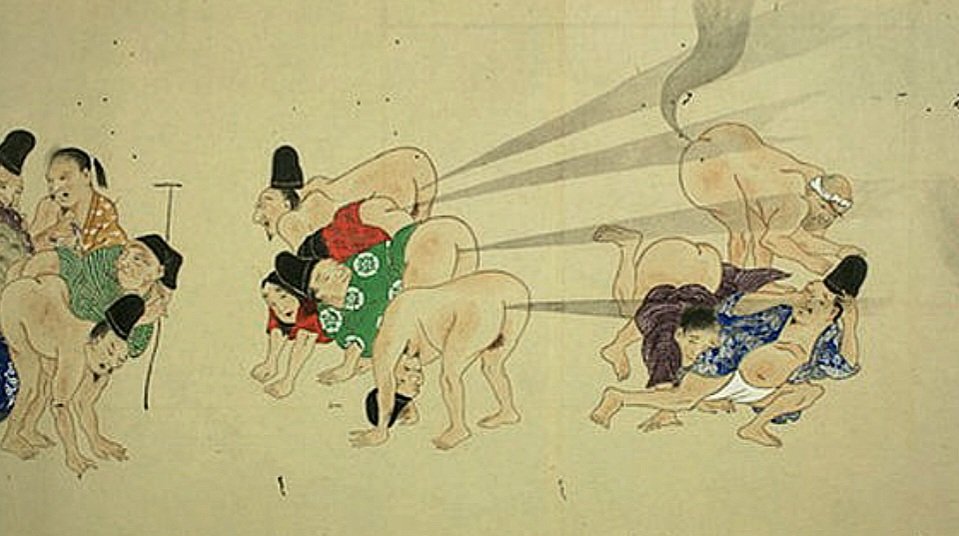W każdej kulturze i każdym społeczeństwie można doszukać się różnych dziwactw i specyficznego poczucia humoru. W japońskim okresie Edo (1603-1868) powstały humorystyczne i satyryczne obrazy zwane he-gassen, które przedstawiały ludzi biorących udział w zawodach w puszczaniu bąków. Niektóre portretowały Japończyków strzelających gazami w kierunku mężczyzn, inne w stronę kobiet lub zwierząt, ale pod koniec Edo wykorzystywano je także celem strojenia drwin z cudzoziemców. Przedstawiano ich jedzących bąki, co miało być wyrazem niechęci i nieufności Japończyków do mieszkańców Zachodu w tamtym okresie czasu, choć nie wszyscy współcześni japońscy badacze zgadzają się z tym stanowiskiem. Ale nie tylko obcokrajowcy padali ofiarą satyry ha-gassen.