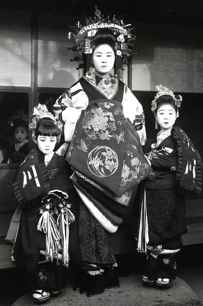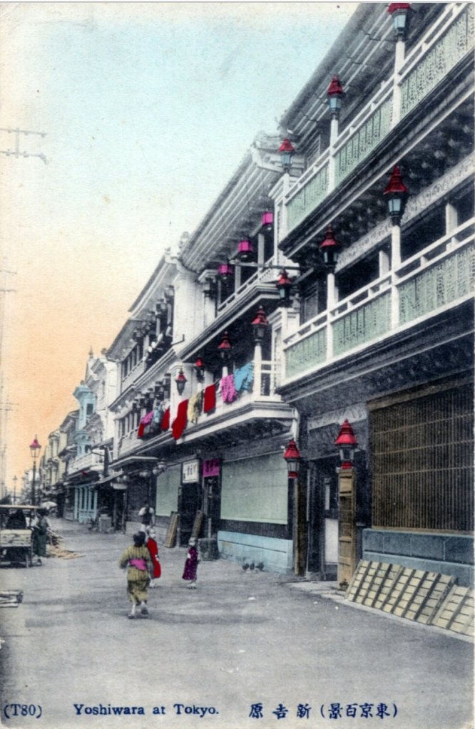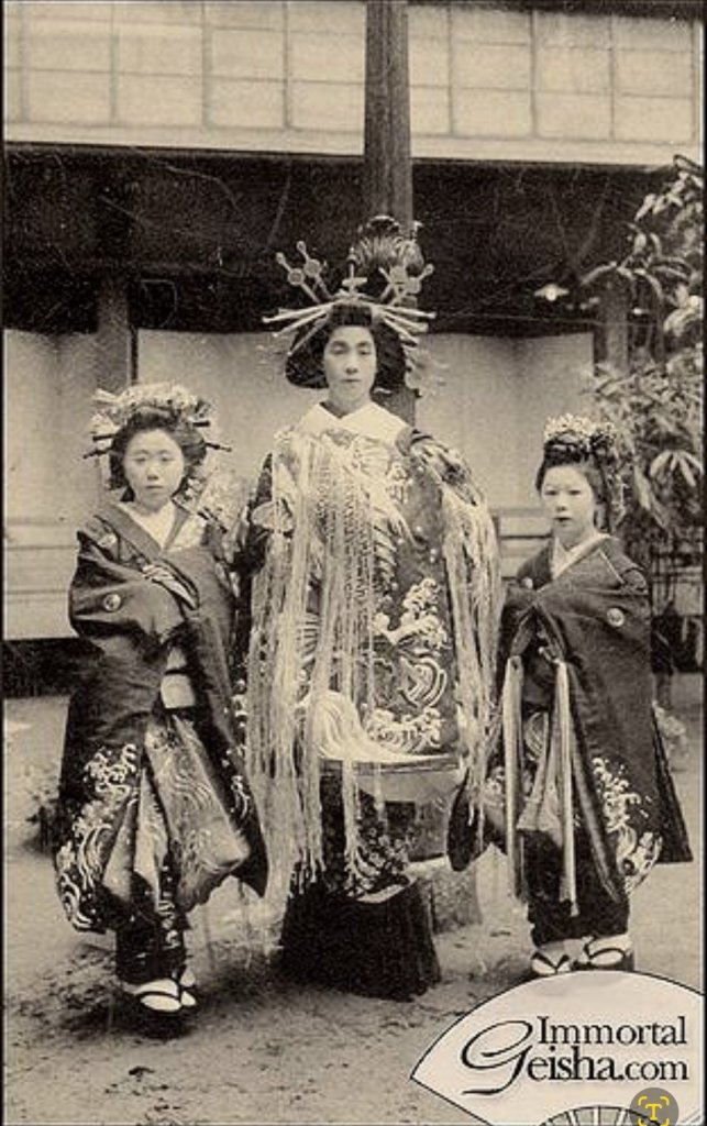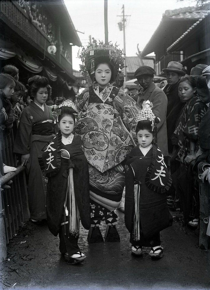Tokio, r. 1910. Japońska kurtyzana oiran (tayu) wraz z towarzyszącymi jej dziewczynkami kamuro pozuje do zdjęcia w dzielnicy czerwonych latarni Yoshiwara – najsłynniejszej z japońskich yūkaku (legalnych dzielnic domów publicznych w Japonii, w przeciwieństwie do okabasho – tych nielegalnych). Utworzona w 1617 roku działała aż do połowy ubiegłego wieku, a dziewczynki kamuro krzątały się po niej jeszcze 100 lat temu.