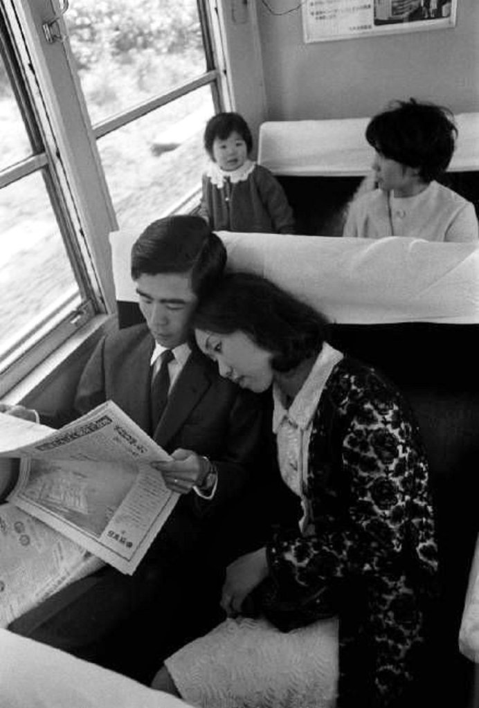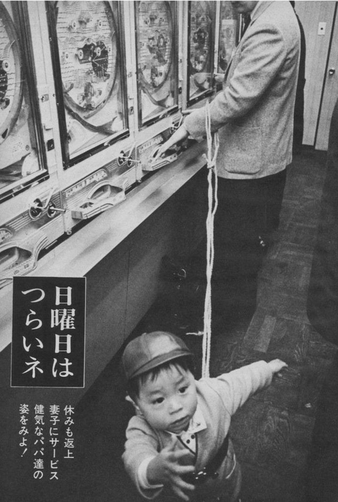 Mężczyzna w salonie pachinko (automaty do gry) z dzieckiem uwiązanym na sznurku. Japonia r. 1969. Dziś dzieci przywiązuje się niewidzialnym sznurkiem do smartfona i są w stanie usiedzieć w bezruchu nawet pół dnia. Postęp. Poniżej kilka fotografii z powojennej Japonii.