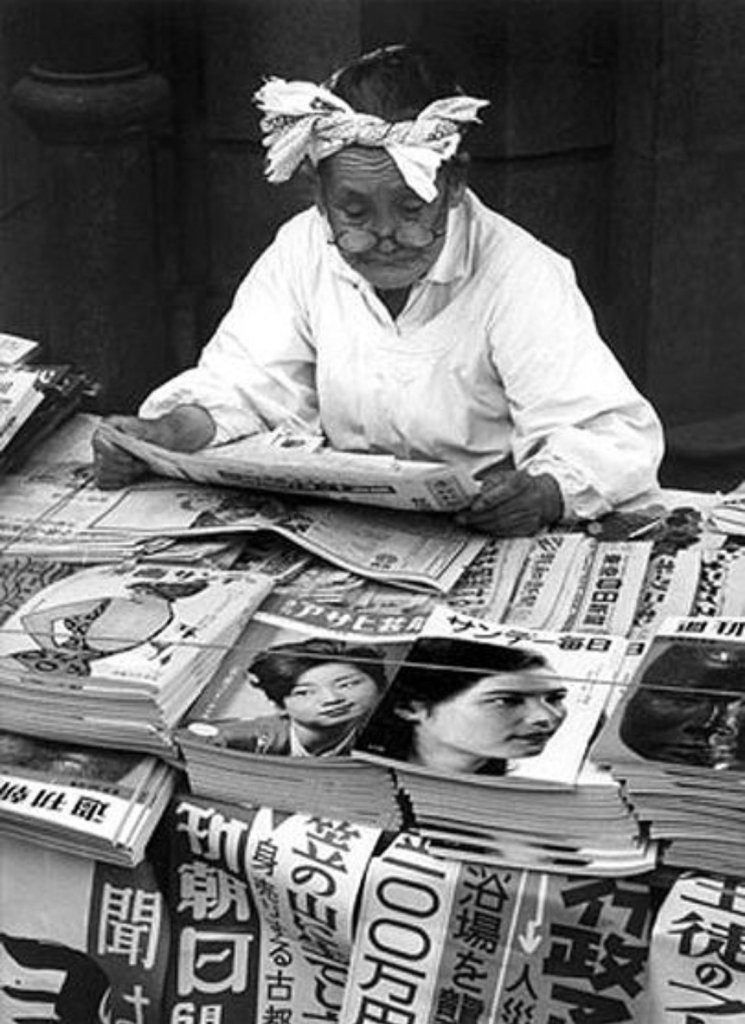 Tokijska dzielnica Ginza, rok 1950. Sprzedawczyni prasy z tradycyjną opaską hachimaki na głowie. Muko hachimaki wiązane są z przodu głowy i noszone były zwłaszcza przez osoby pracujące w niektórych zawodach. Hachimaki (zwane dawniej matsuko) pierwotnie miały utrzymywać długie włosy w ładzie.