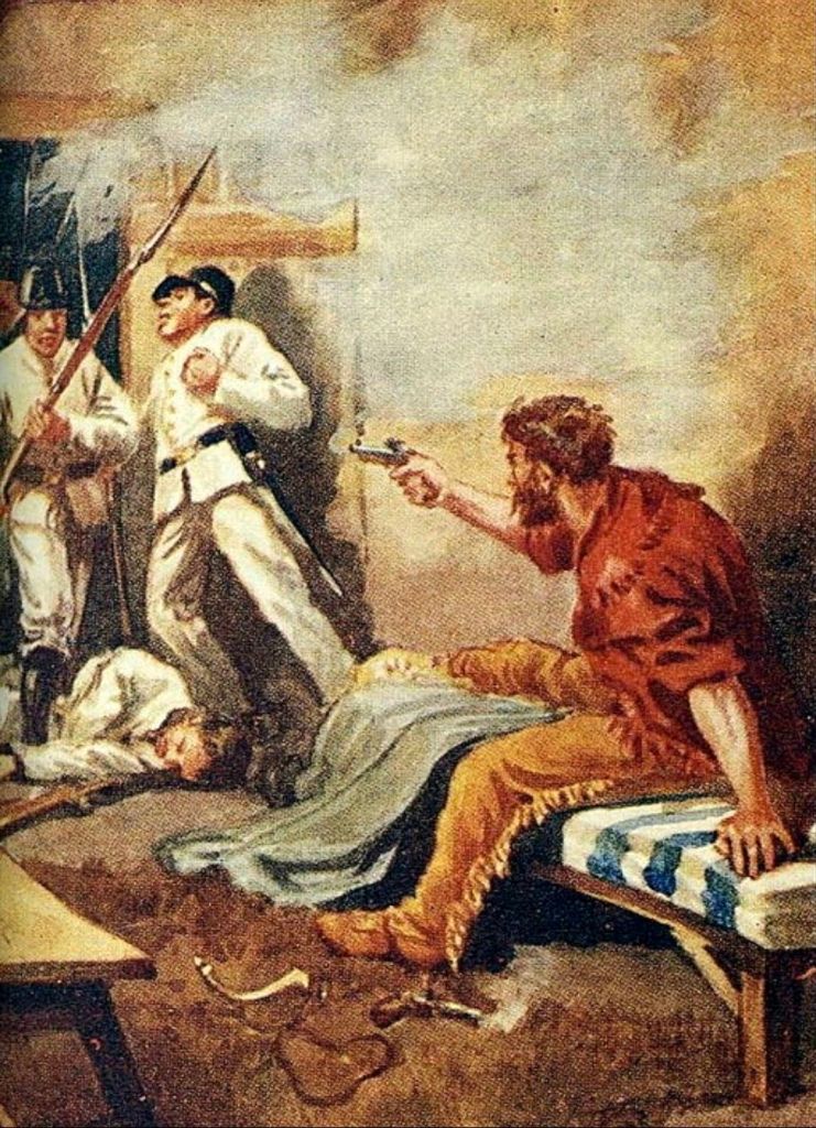 „Śmierć Jamesa Bowie” z roku 1890. Jim Bowie to wręcz ikoniczny przedstawiciel tej samej południowej, szkocko-irlandzkiej kultury pogranicza, tylko w jeszcze bardziej ekstremalnej wersji niż Crockett. Jim Bowie był wykuty z tego samego materiału kulturowego: ulsterscy Szkoci, Pogranicze, Południe, honor, przemoc i indywidualizm.