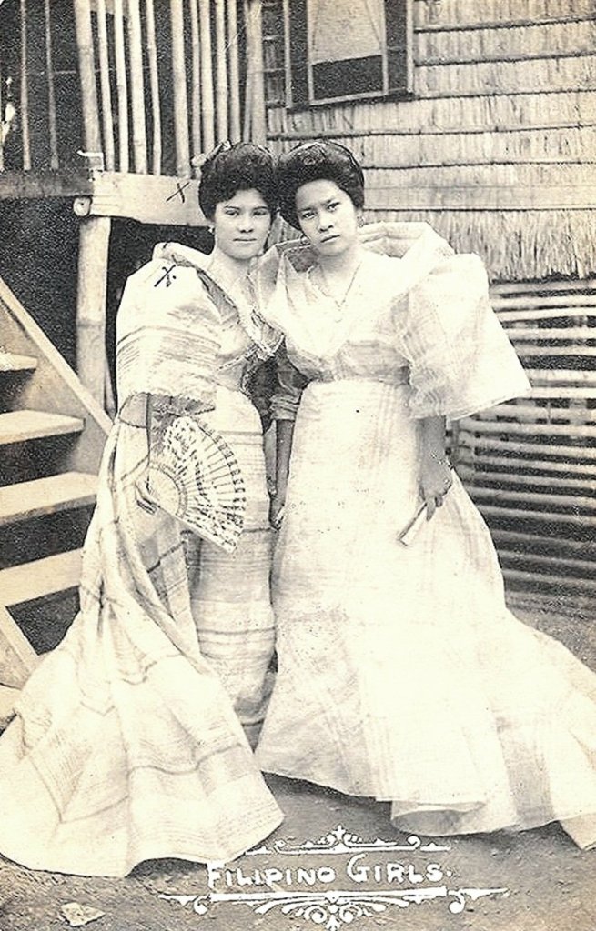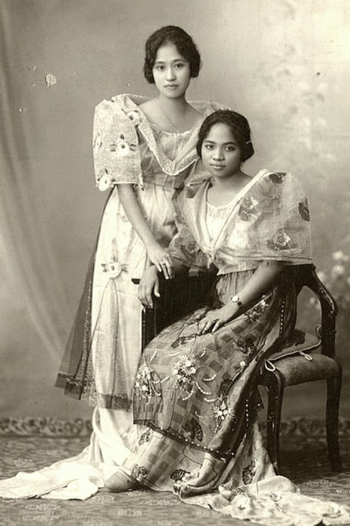 Dwie Filipinki, z których jedna jest pochodzenia japońskiego (📷☝️), pozują do zdjęcia w popularnych na Filipinach na początku 20. wieku sukniach wizytowych zwanych Maria Clara. Stroje te zwano je również traje de mestiza, gdyż łączyły zarówno wpływy tubylcze, jak i hiszpańskie. W erze przed-kolonialnej przeznaczenie odzieży było w znacznej mierze podyktowane funkcją, a nie stylem czy estetyką.