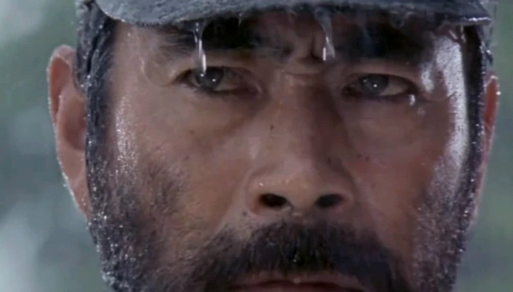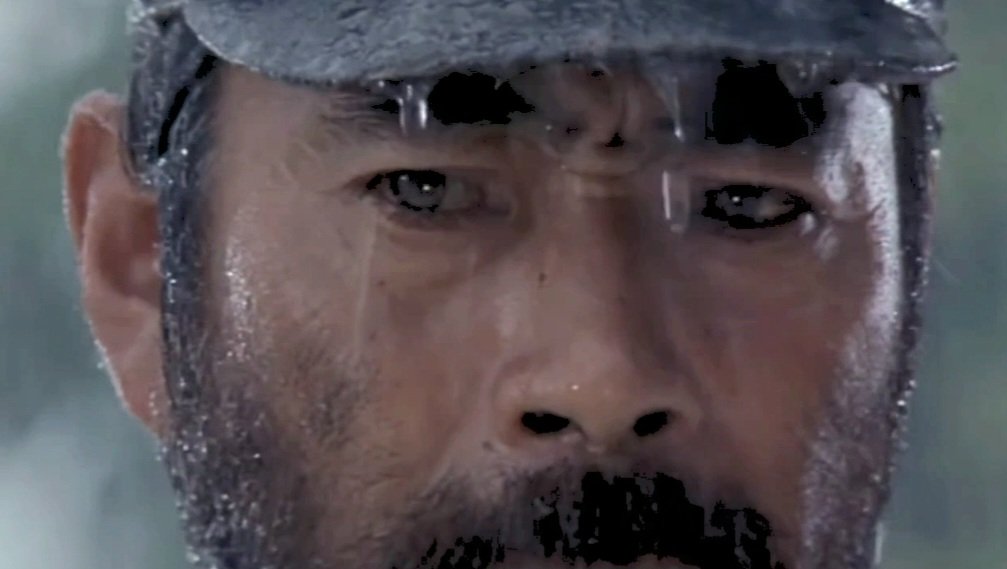 Hirohito jest prawie całkowicie przysłonięty – widać jedynie fragment siwej czupryny nad ramieniem żołnierza. Ford stoi wyprostowany, patrzy na cesarza z góry, twarz całkowicie poważna, bez śladu uśmiechu. Brak jakiegokolwiek ukłonu czy pochylenia głowy. Postawa prezydenta jest sztywna, ręce wzdłuż ciała, zero mikro-ruchów adaptacyjnych.