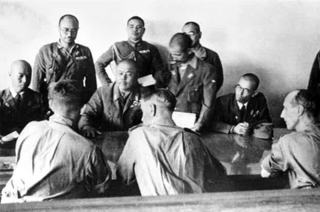Hirohito, reprezentujący bardziej formalny i hierarchiczny japoński protokół, pozostaje chwilowo w stanie wewnętrznej koncentracji i oczekiwania na wyraźniejszy sygnał przejścia.