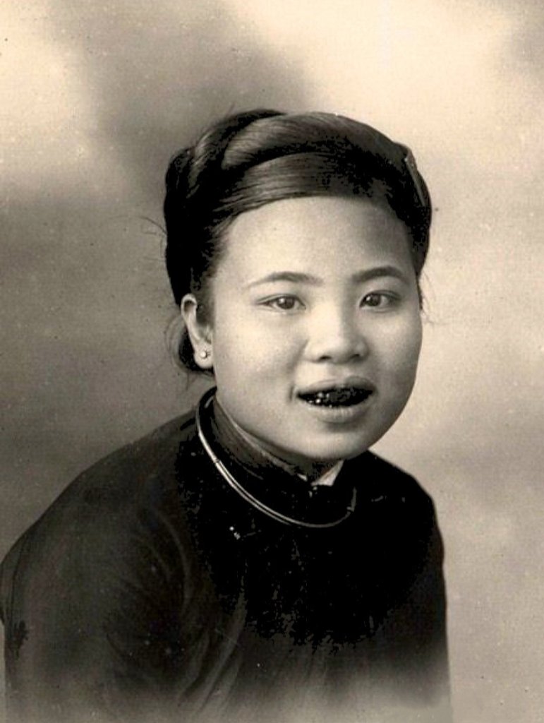 Dawne narzędzia używane w Japonii do czernienia zębówWietnamka na przełomie XIX i XX wieku.Zwyczaj czernienia zębów nie ograniczał się wyłącznie do Japonii.