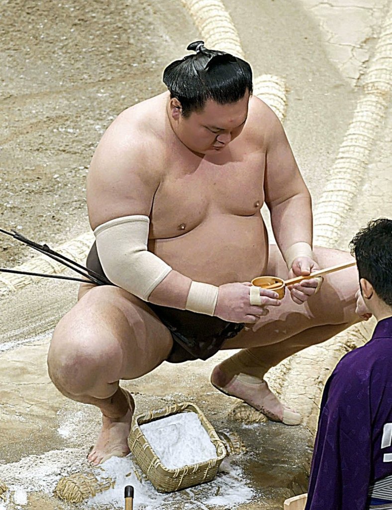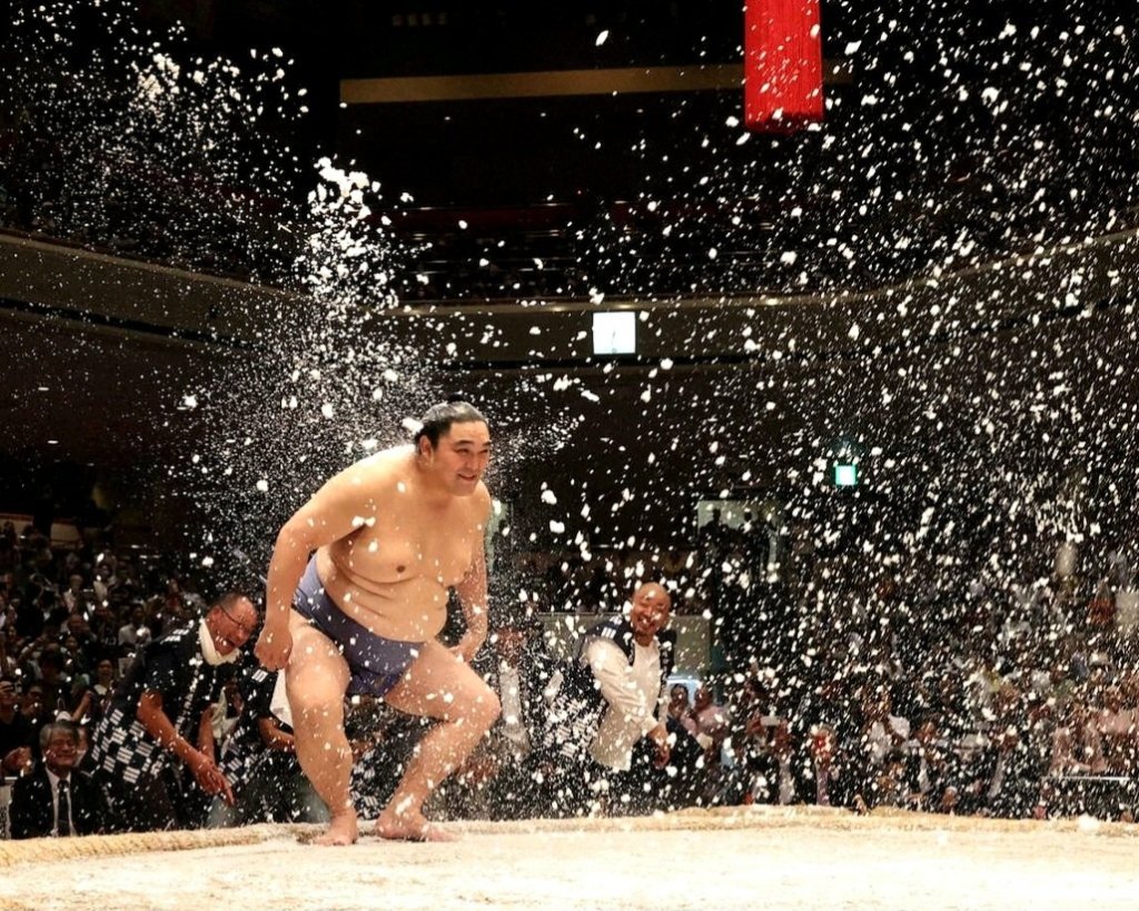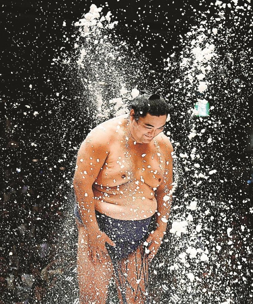 Zawody sumo ubarwione są wieloma rytuałami, a jednym z nich jest intrygujący rytuał rozrzucania po ringu soli, choć niekoniecznie zawsze tak obficie jak na fotografii. Przechodzący na emeryturę sumotori Okinoumi Ayumi ze stajni Hakkaku pochodzi z miasta Okinoshina na wyspach Oki, gdzie tradycyjnie podczas zawodów sumo sypie się znaczne ilości tej białej substancji. Sól, która dla zapaśników dostępna jest w koszykach shiokago umieszczonych w dwóch z czterech narożników dohyo, od czasów starożytnych jest w Japonii uznawana za świętą i używana jest również w religii shinto w rytuałach oczyszczających jako narzędzie do odpędzania złych duchów. Zawodnikom sumo służy również jako środek antyseptyczny oraz pomaga osuszyć spocone ręce. Po skończonej walce, która w sumo rzadko trwa dłużej niż kilka, kilkanaście sekund, na ring dohyo i zapaśników w Okinoshima ponownie opada kilkadziesiąt garści soli.
