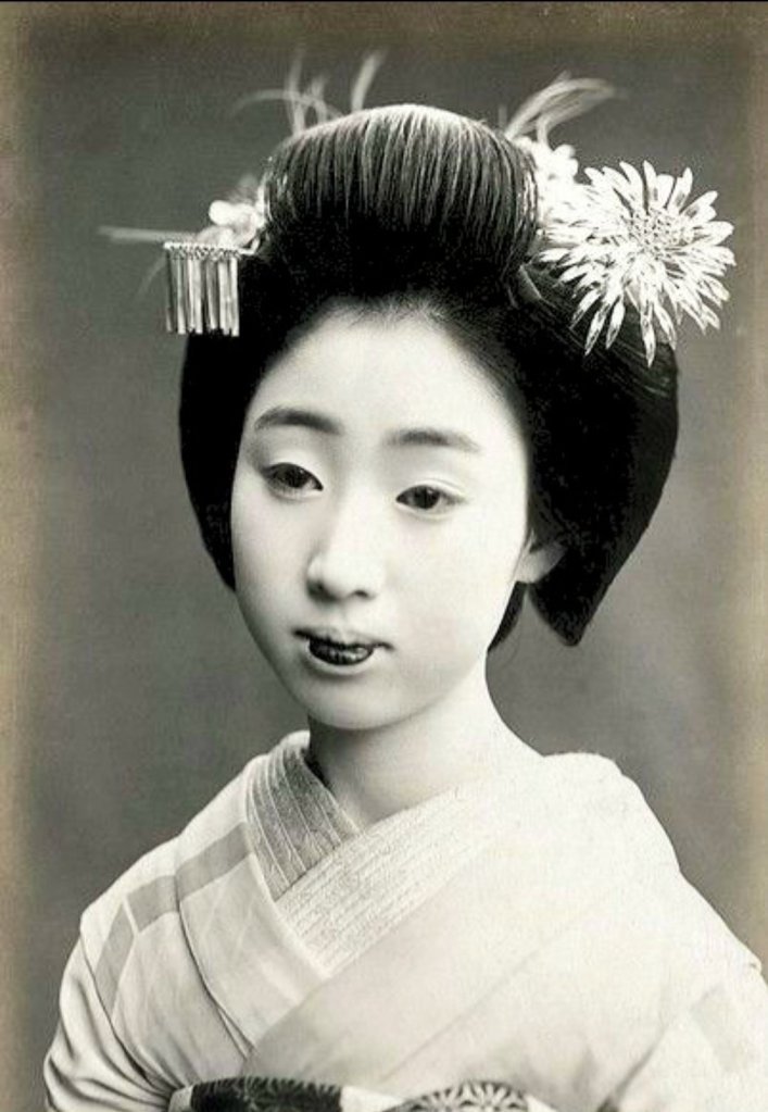 Maiko (uczennica na gejszę) Fukusuko z podkładem oshiroi na twarzy. Ok. 1930.